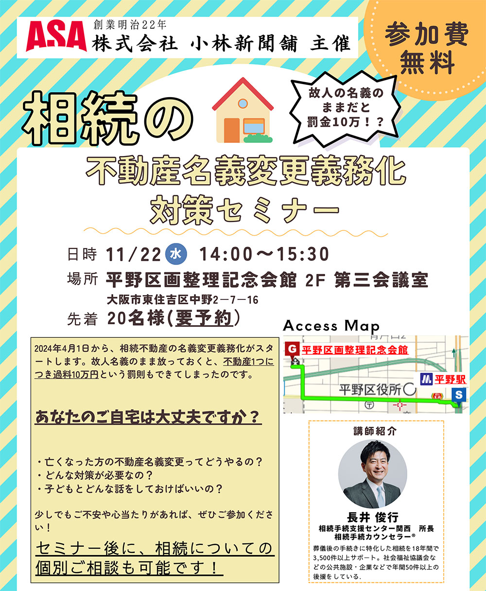 | タイトル | 「相続の不動産名義変更義務化 対策セミナー」 |