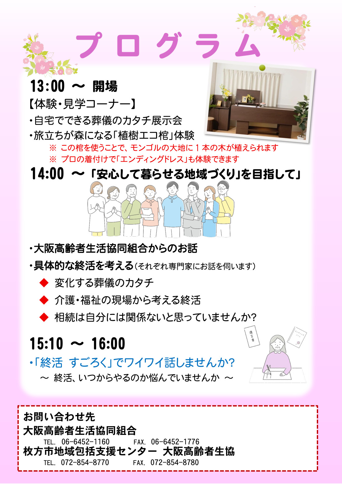 | 問合せ先 | 大阪高齢者生活協同組合 06-6452-1160 枚方市地域包括支援センター 072-854-8770 |