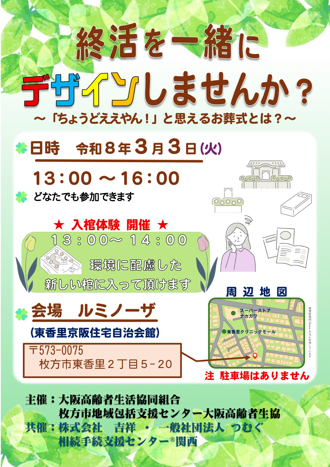 | タイトル | 「ちょうどええやん!」と思えるお葬式とは? 終活デザイン・入棺体験会 |
