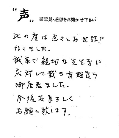 誠実で親切な先生方に応対して戴き(大阪市大正区 S.F様) 2016 2/18 ご相談者の声 2016.02.18 此の度は色々とお世話になりました。 誠実で親切な先生方に応対して戴き有難う御座いました。 今後共よろしくお願い致します。 こんなページもよく見られています 人気記事:「どこまで調べられる?故人の財産の大調査!」 マンガで分かる無料相談 お客様の声(約90人の方からの実際の声を掲載中) 相続 無料相談の予約はこちら >> ご相談者の声 終活Cafe with 葬祭流儀 vol.2 終活トピックで紹介 また、何かありましたらお願いしたいと思います(守口市 H.Y様) 関連記事 お願いしてよかったと心から感謝しております。(大阪市東住吉区 K様) 2024.04.25 貴社のスタッフの方の温かさや誠実さ(高槻市 M.M.様) 2013.09.02 感謝はここには書ききれません(大阪市鶴見区 E.M.様) 2017.05.21 丁寧にわかりやすく説明してもらったので安心して恃めました。(東大阪市 Y様) 2023.11.01 ありがとうございました(大阪市 H.K.様) 2013.09.30 おまかせした事をとても喜んでいます(東大阪市 N.T様) 2017.12.04 堅いイメージだった税理士の先生も優しく対応いていただけて良かったです。(大阪市東淀川区F.K様) 2022.10.20 安心感があって本当によかったです(東大阪市 S.T様) 2017.06.06
